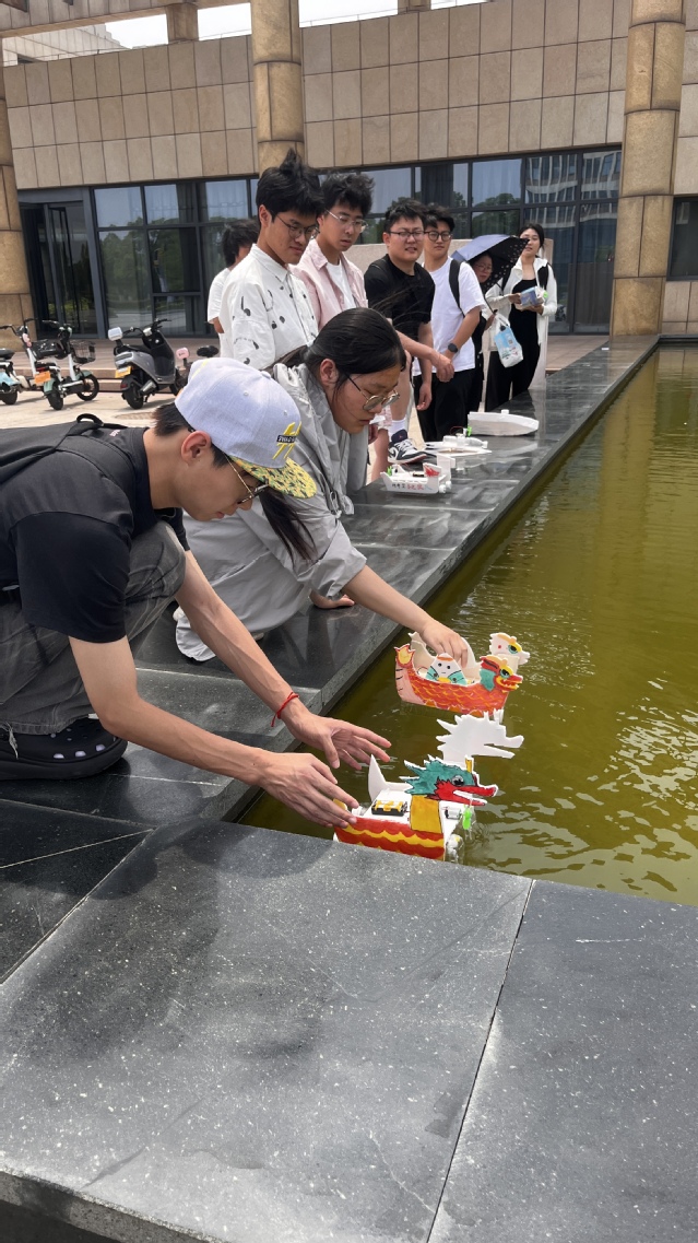 此次活动以废旧泡沫板、宣传板和塑料瓶为主要原料,手工制作龙舟模型。活动现场,参赛的各组同学手持亲手制作的龙舟跃跃欲试。这些龙舟虽以泡沫纸为材料,却精巧别致、各具特色——有的船身绘满端午元素,有的龙头造型栩栩如生,将传统文化与创意设计巧妙融合。随着发令声响,同学们或用手推波浪使龙舟前进,或用小马达和螺旋桨做风动力、水动力,在池上展开一场别开生面的角逐。