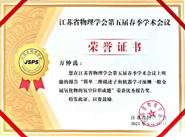 万仲禹,2017级化学工程与工艺专业毕业生。被推荐至香港城市大学理论与计算物理专业直接攻读博士学位并获得全额奖学金。近年来,以第一作者和通讯作者身份在《Phys. Chem. Chem. Phys., New J. Chem., Org. Biomol. Chem.,Comput. Mater. Sci.,Phys. Lett. A,Chem. Phys. Lett., Int. J. Quantum Chem.》和《J. Mol. Struct.》等国际知名学术期刊发表论文16篇,其中SCI收录10篇,另有3篇在投。研究方向为凝聚态理论与计算,理论与计算化学。研究内容包括(1)分子,固体晶格,材料,化学反应性质的快速计算和预测,(2)具有高性能/奇异特性的热电/光电/超导/绝缘材料的高通量虚拟筛选,(3)半经验量子化学(SQC)方法和密度泛函理论(DFT)的改进和校正。此外,参加了包括高等数学,英语和数学建模在内的多学科竞赛,取得了国际级2项,国家级3项,省级4项的优秀成绩。在2020年被北京大学选拔进入全国优秀老员工夏令营,2021年被清华大学选拔进入低维量子物理国家实验室暑期公司。在2021年参加江苏省物理学会举办的春季学术会议并获得优秀报告奖。此外担任《Surf. Topogr.-Metrol.》,《New J. Chem.》和《J. Mol. Model.》等国际期刊审稿人。