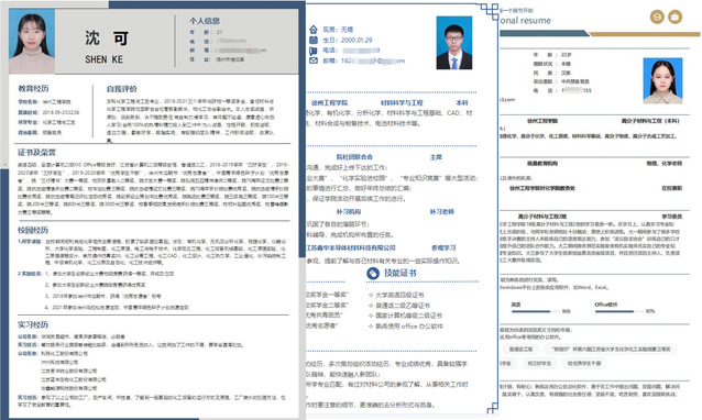 大赛共收到了来自毕业班同学们的优秀作品一百五十余份。制作精美的简历展示了毕业生们在大学四年的成长,是他们毕业离校后建功时代、大放异彩的誓言。经过认真评比,来自18应化1班的杨雪颖、18高分子(3+2)班的经涛等七名同学获得一等奖。