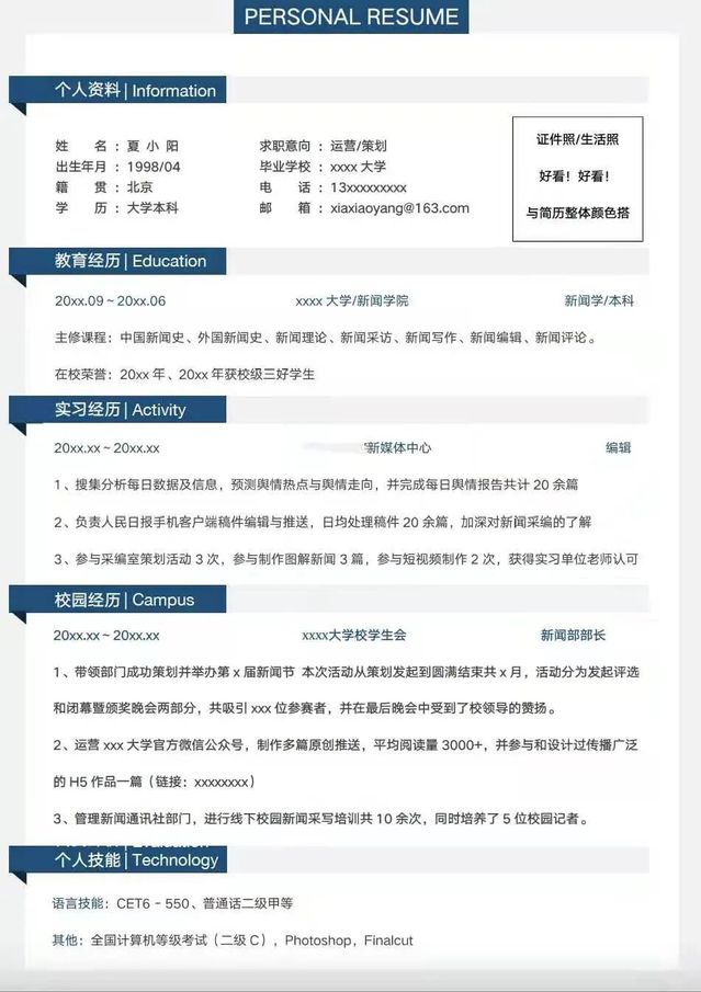 5、照片用证件照或者好看的他拍照,与简历主色调协调即可,不要放带着贴纸的自拍照,简约大方是标准。