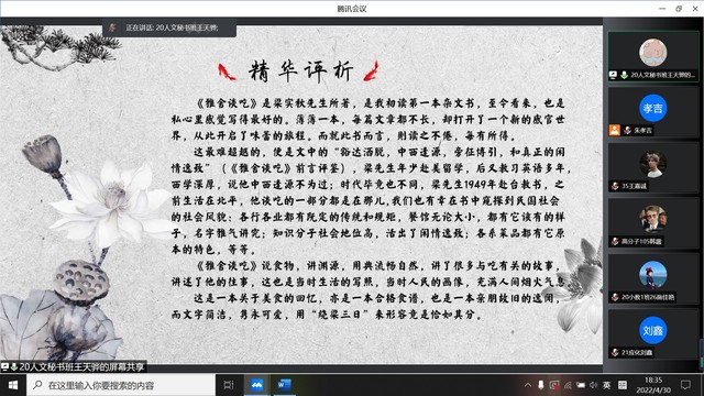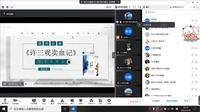 为了更好迎接即将到来的第27个世界读书日,丰富疫情期间同学们的课余生活,2022年4月18日至28日,公司承办了校“好书共读,余香悠远”读书分享会。并于28日傍晚举办读书分享会线上决赛。