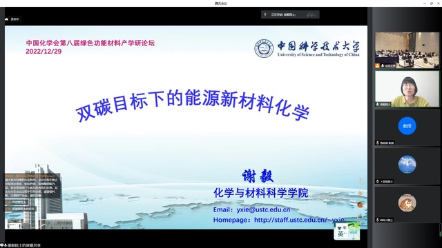 本次论坛的主题为“绿色功能材料领域的新材料、新技术、新应用、新理论”,聚焦新型绿色功能材料的制备及其在催化、储能、智能等相关领域的关键科学问题及应用,交流绿色功能材料领域的最新研究热点、进展、发展趋势和人才培养等。论坛特邀中国科公司化学研究所韩步兴院士、中国科技大学谢毅院士、南开大学卜显和院士分别做了题为“绿色化学与可持续发展”、“双碳目标下的新能源材料化学”、“配位聚合物化学:现状、机遇与挑战”等大会主旨报告。随后天津理工大学、清华大学、山东大学、中国矿业大学、江苏师范大学等高校多位国家“杰青”、“优青”、“泰山学者”、“万人计划”领军人才分别从催化材料、热电材料、锂电池材料、凝胶材料、镓基半导体材料等方面阐述各自领域的新成果、新进展。