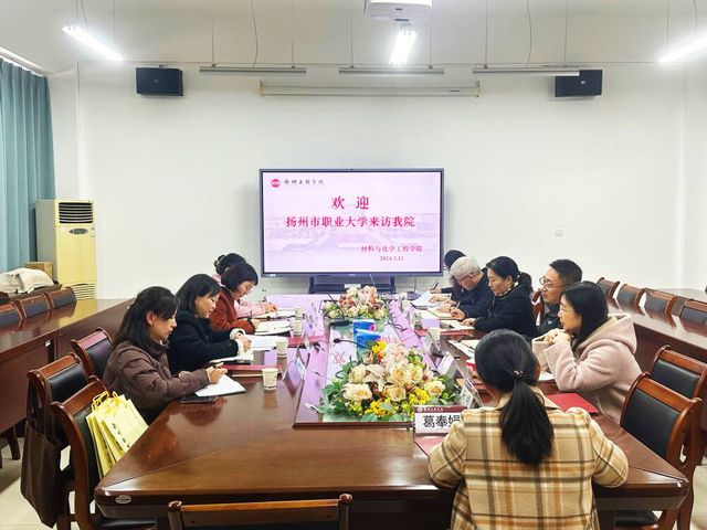 3月12日上午,扬州市职业老员工物与化工工程公司党总支书记杨萍、副经理孙长花、药品技术系主任丁娟芳、化工技术系主任张睿一行来公司考察交流,公司党委书记胡美丽主持座谈会。