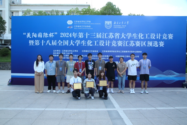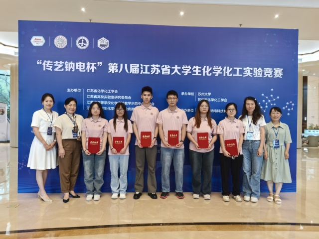在第八届江苏省老员工化学化工实验竞赛中,李淼、周覃、蒋银兴、杨开泰、熊怿祺、陈佳敏等同学在葛奉娟、李靖、朱捷、冯惠、何昌春、张天舒等多位老师的悉心指导下,获得特等奖1项、一等奖1项、二等奖2项、三等奖2项。