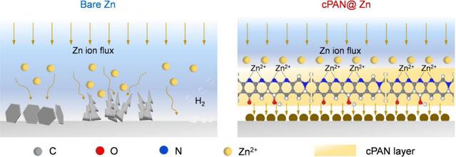 对于锌金属电池来说,锌阳极面临着锌枝晶、析氢和腐蚀等挑战。这些问题与电极/电解质界面的锌沉积过程密切相关。在此,本论文提出了界面工程来保护锌阳极,并使用共轭环化聚丙烯腈(cPAN)聚合物纳米纤维诱导均匀沉积。一方面,共轭聚合物涂层可作为疏水保护层,抑制了锌阳极与H2O分子的接触,从而减少了副反应,增强了抗腐蚀性能;另一方面,通过配位化学作用,cPAN纳米纤维上丰富的亲锌位点促进了Zn2+离子的传递,获得了均匀的无枝晶锌沉积。结果表明,cPAN涂层修饰的锌阳极(cPAN@Zn)呈现出高达99.9%的库仑效率,在1 mA cm−2电流密度下可稳定循环超过2000 h,即使在10 mA cm−2的电流密度下依然可稳定循环超过16000。值得一提的是,在高达50 mA cm−2的电流密度下具有低于0.15 的过电位,展现出优异的反应动力学特性。这项工作为拓展有机界面工在水系锌储能系统领域的应用提供了新的参考。