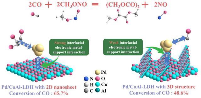 在工业催化反应中,CO酯化制备草酸二甲酯(DMO)是煤制乙二醇(EG)的重要步骤。钯基催化剂已被证明是有效的催化剂。之前研究发现MgAl-LDH载体与Zn2+可以通过形成Pd-Zn共价键来稳定Pd团簇 (Nanoscale, 2020, 12, 14825-14830),此外含有大量氧缺陷修饰的ZnTi-LDH可以改善界面电子转移,形成Pd-Ti键,从而提高Pd/ZnTi-LDH催化剂在CO酯化反应中的稳定性 (ACS. Applied. Materials & Interfaces. 2021,13, 24856-24864)。然而,载体形态对界面电子转移的影响尚未得到充分的揭示。此工作制备具有二维(2D)纳米片和三维(3D)花状结构的CoAl-LDH新型的载体材料,进一步通过原子层沉积(ALD)负载Pd团簇。在CO酯化制备 DMO反应中,Pd/2D-CoAl-LDH催化剂的CO转化率(65.7%)明显高于Pd/3D-CoAl-LDH催化剂(48.6%)。XAFS、XPS和CO2-TPD表征表明,Pd团簇在2D-CoAl-LDH表面电子密度高于3D-CoAl-LDH载体。此外,原位红外吸附CO分析表明,富电子Pd团簇促进了Pd向CO的电子转移,从而提高热催化性能。该研究揭示了调节载体形态如何增强界面电子转移,从而进一步提高热催化效率。
