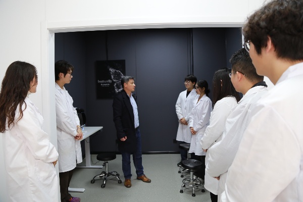 谭董事长首先来到了化妆品实验室中的手工透明皂制作现场,对员工进行样品检测工作的专注和努力表示高度赞赏。在微生物实验室,谭董事长强调,同学们应充分利用公司提供的优质平台积极参与各类比赛,通过“以赛促教、以赛促学”的方式不断提升自我。